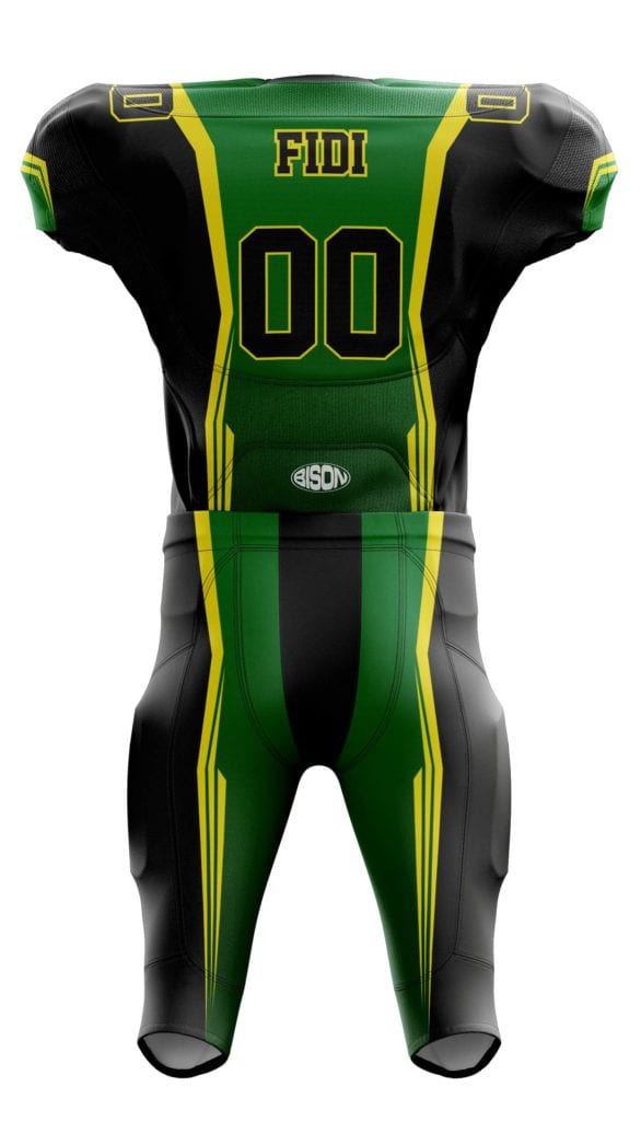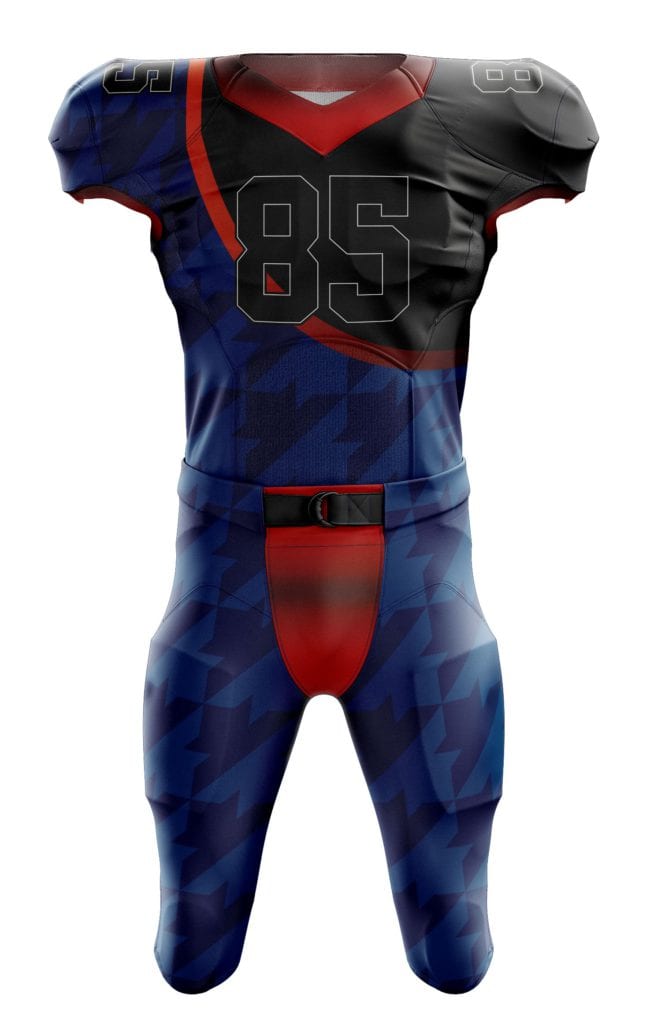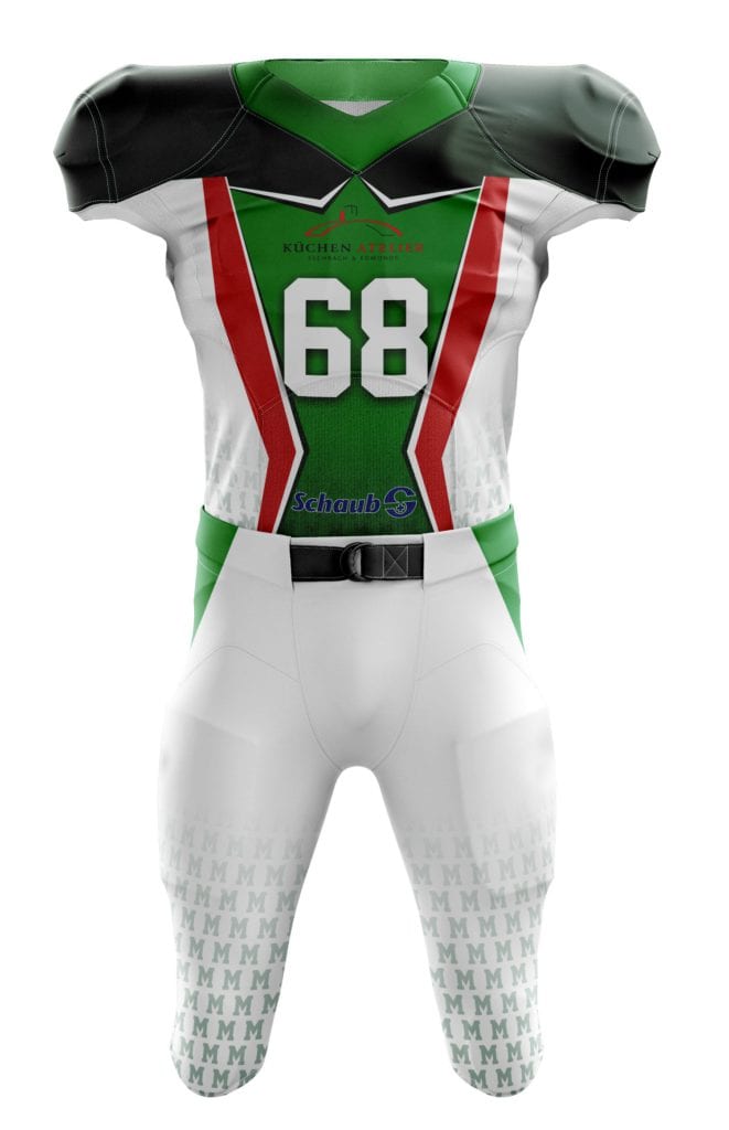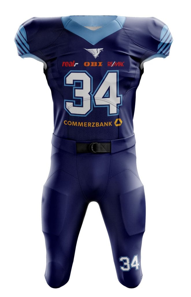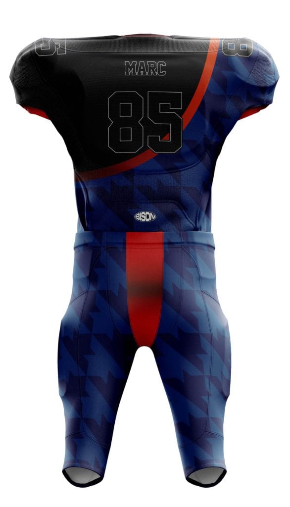 Podobně bude vypadat návrh designu, který vám pošleme poté, co vytvoříte svoji nezávaznou poptávku v našem konfigurátoru dresů na americký fotbal.