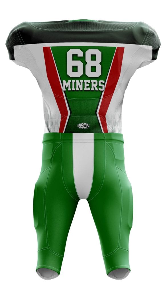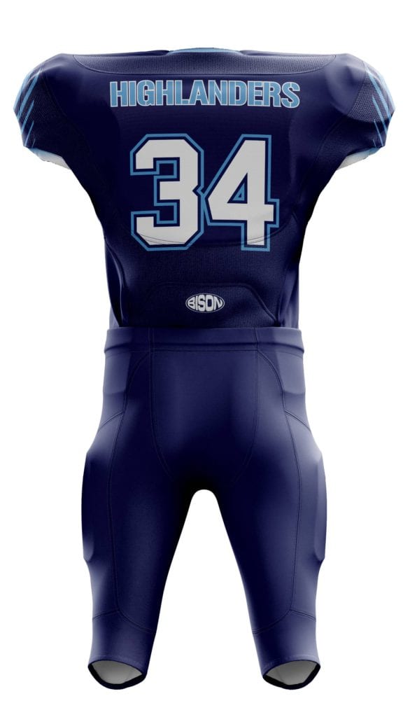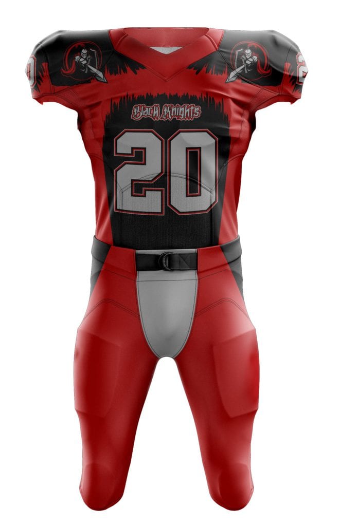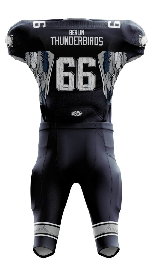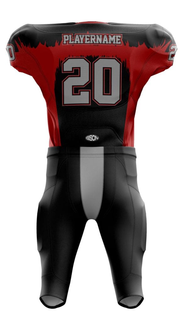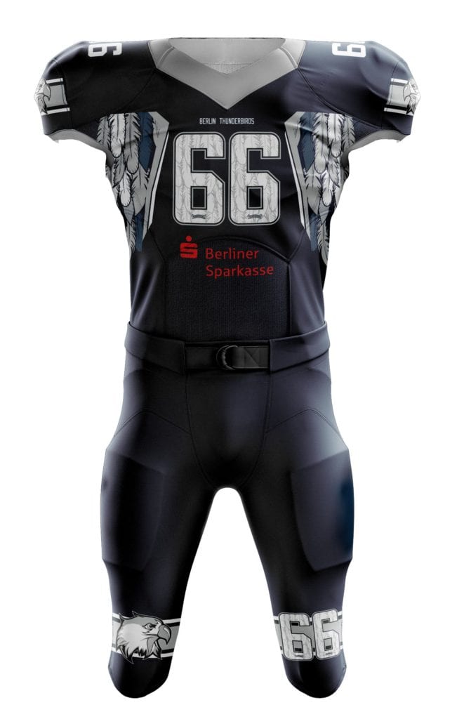 Podobně bude vypadat návrh designu, který vám pošleme poté, co vytvoříte svoji nezávaznou poptávku v našem konfigurátoru dresů na americký fotbal.