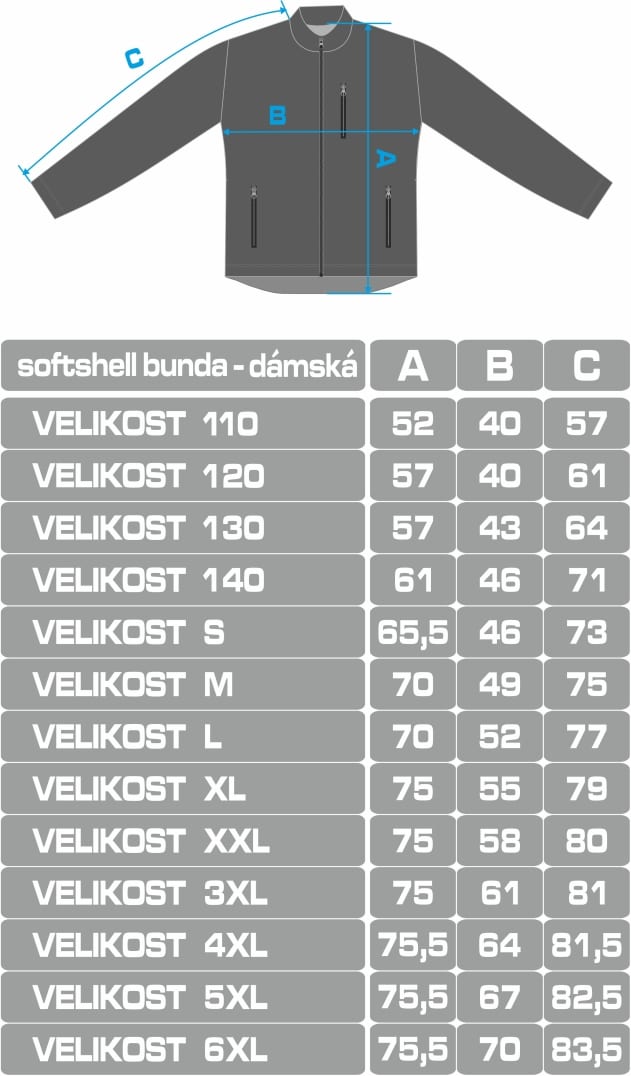 Doporučený způsob zjištění potřebné velikosti: bundu, která Vám přesně sedí, položte na stůl a v napnutém stavu změřte šířku i výšku bundy. Naměřené hodnoty porovnejte s tabulkou.